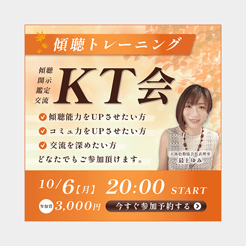 セミナー告知用バナー 2025.09 BANNER DESIGN 【目 的】LINE登録者、Instagramフォロワー中心に向けたセミナー開催告知用のバナーデザインの作成。【デ ザ イ ン】2025年10月より月1回債のセミナーイベント『傾聴トレーニング KT会』の告知用画像を制作させて頂きました。ヒアリング時に、各月ごと季節感を出してほしいとご要望だったので、今回は10月という事もあり、オレンジを主としたイチョウをベースに、タイトルをはじめとする文字はブラウンを使い、視認性とのバランスを見ながら制作致しました。 制作ツール / PHOTOSHOP セミナー告知用バナー 2025.09BANNER DESIGN 【目 的】LINE登録者、Instagramフォロワー中心に向けたセミナー開催告知用のバナーデザインの作成。【デ ザ イ ン】2025年10月より月1回債のセミナーイベント『傾聴トレーニング KT会』の告知用画像を制作させて頂きました。ヒアリング時に、各月ごと季節感を出してほしいとご要望だったので、今回は10月という事もあり、オレンジを主としたイチョウをベースに、タイトルをはじめとする文字はブラウンを使い、視認性とのバランスを見ながら制作致しました。 制作ツール / PHOTOSHOP © "Less Is More ? " LIM DESIGN