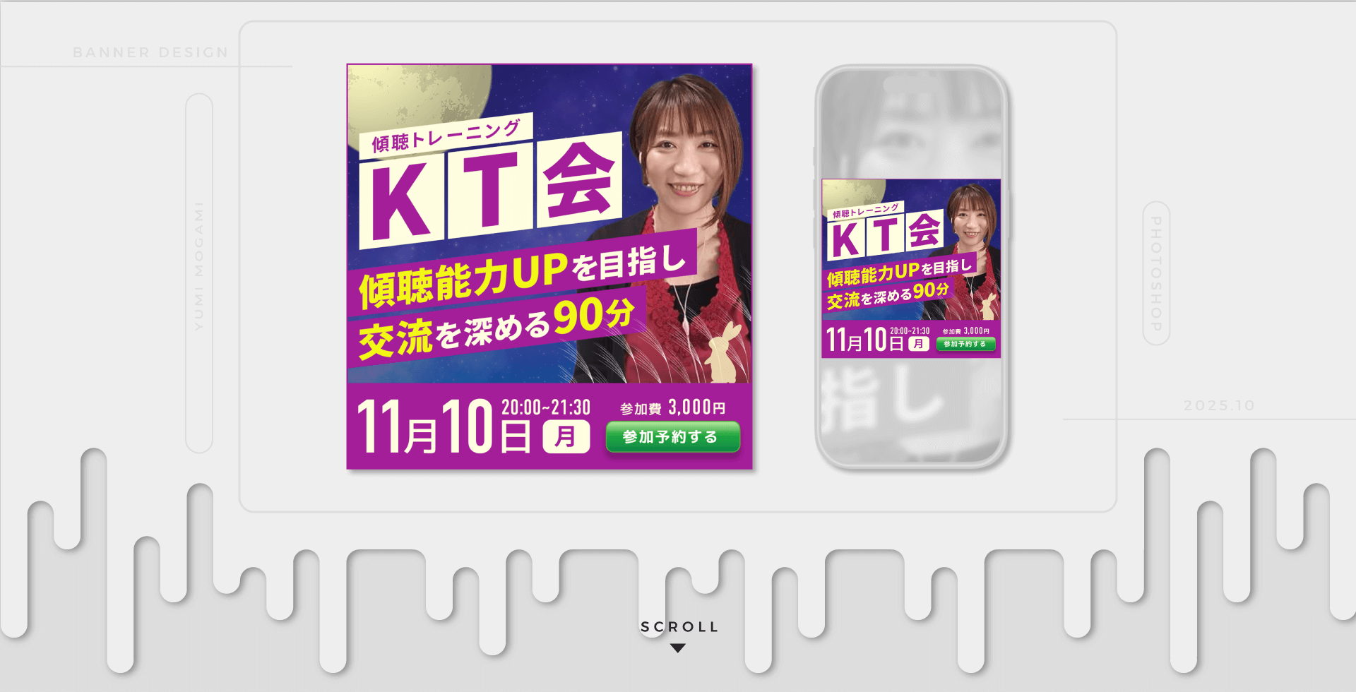 セミナー告知用バナー 2025.10 BANNER DESIGN 【目 的】LINE登録者、Instagramフォロワー中心に向けたセミナー開催告知用のバナーデザインの作成。【デ ザ イ ン】2025年9月より月1回開催のセミナーイベント『傾聴トレーニング KT会』の告知用画像を制作させて頂きました。ヒアリング時に、各月ごと季節感を出してほしいとご要望だったので、今回は秋の夜長をテーマに制作させて頂きました。また文字などの配色に関しては最上ゆみさんのZOOM背景から引用し、視認性とのバランスを見ながら制作致しました。 制作ツール / PHOTOSHOP セミナー告知用バナー 2025.10BANNER DESIGN 【目 的】LINE登録者、Instagramフォロワー中心に向けたセミナー開催告知用のバナーデザインの作成。【デ ザ イ ン】2025年9月より月1回開催のセミナーイベント『傾聴トレーニング KT会』の告知用画像を制作させて頂きました。ヒアリング時に、各月ごと季節感を出してほしいとご要望だったので、今回は秋の夜長をテーマに制作させて頂きました。また文字などの配色に関しては最上ゆみさんのZOOM背景から引用し、視認性とのバランスを見ながら制作致しました。 制作ツール / PHOTOSHOP © "Less Is More ? " LIM DESIGN