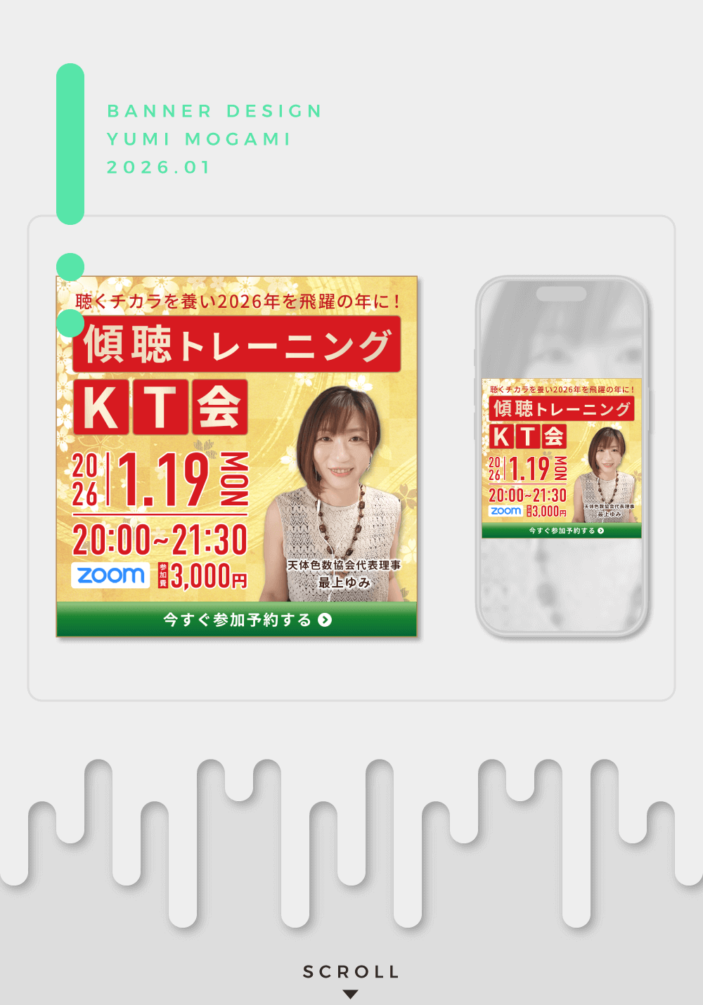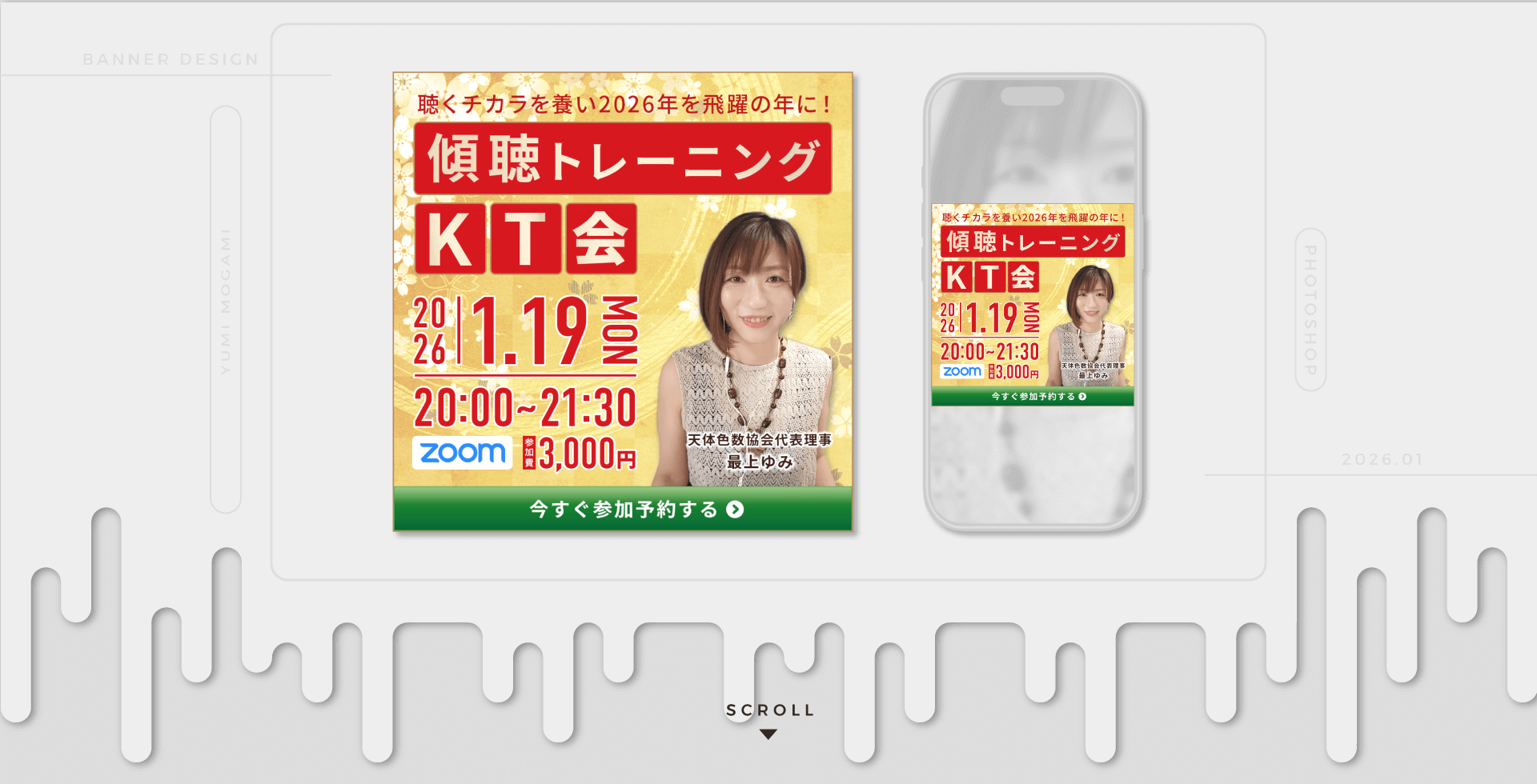 セミナー告知用バナー 2026.01 BANNER DESIGN 【目 的】LINE登録者、Instagramフォロワー中心に向けたセミナー開催告知用のバナーデザインの作成。【デ ザ イ ン】2025年9月より月1回開催のセミナーイベント『傾聴トレーニング KT会』の告知用画像を制作させて頂きました。ヒアリング時に、各月ごと季節感を出してほしいとご要望だったので、今回は1月開催とのこともあり正月をテーマに、季節感の雰囲気と文字の視認性とのバランスを見ながら制作致しました。 制作ツール / PHOTOSHOP セミナー告知用バナー 2026.01BANNER DESIGN 【目 的】LINE登録者、Instagramフォロワー中心に向けたセミナー開催告知用のバナーデザインの作成。【デ ザ イ ン】2025年9月より月1回開催のセミナーイベント『傾聴トレーニング KT会』の告知用画像を制作させて頂きました。ヒアリング時に、各月ごと季節感を出してほしいとご要望だったので、今回は2026年1月開催とのこともあり正月をテーマに、季節感の雰囲気と文字の視認性とのバランスを見ながら制作致しました。 制作ツール / PHOTOSHOP © "Less Is More ? " LIM DESIGN