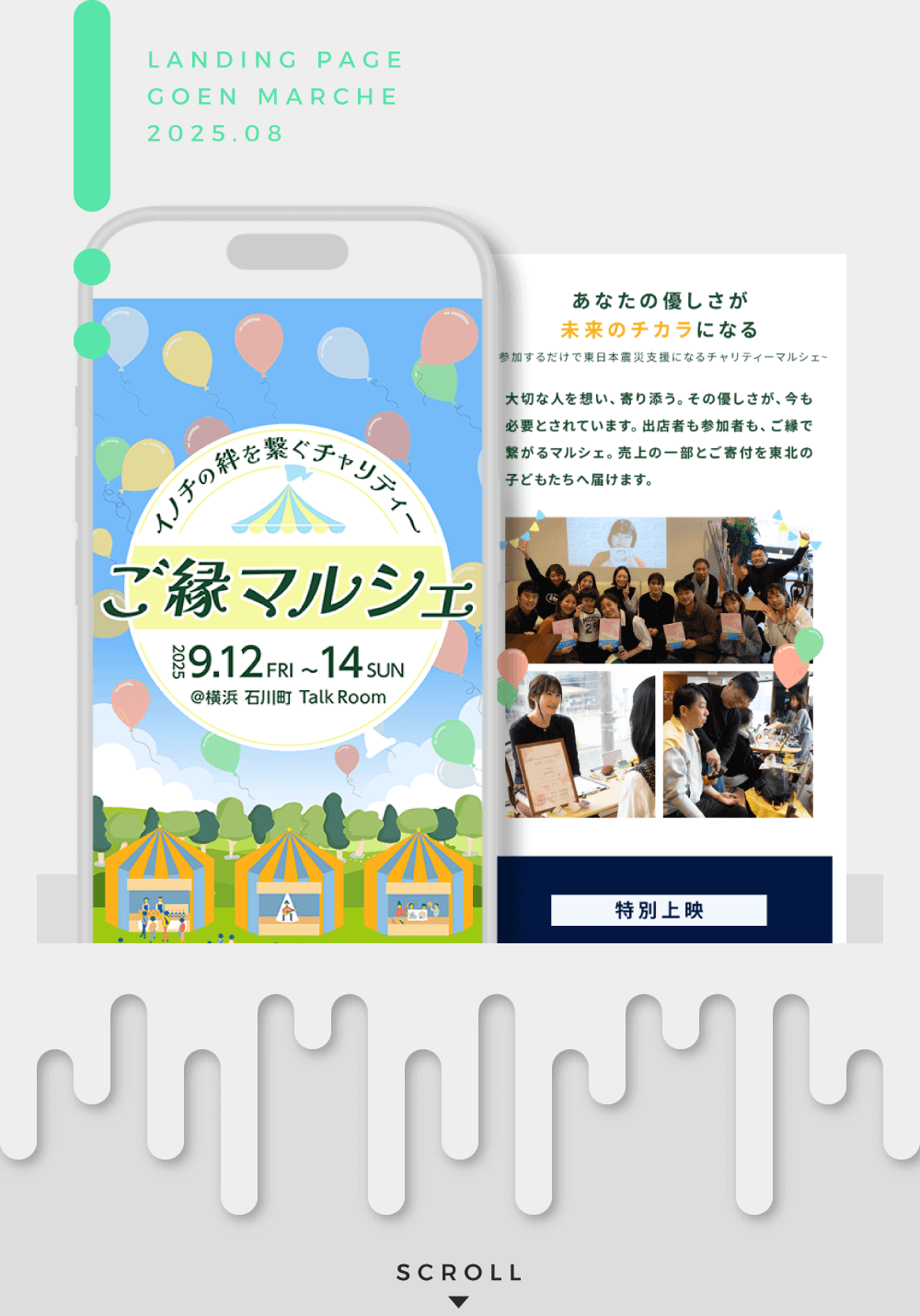 イノチの絆を繋ぐチャリティー ご縁マルシェ 2025 / 08 LPデザイン 2025年9月12日~14日の3日間、横浜で開催されるイノチの絆を繋ぐチャリティーご縁マルシェ様の告知用LP(ランディングページ)を制作させて頂きました。【目的】・マルシェ参加への誘導目的だけでなく、イベントを通じ東日本大震災被災地に向けたチャリティー賛同してもらうためのLP。【制作内容】・スマホ特化型でデザインを作成。・必要セクションの御提案。・ロゴマークの作成。 制作ツール / PHOTOSHOP・HTML・CSS LPデザイン > イノチの絆を繋ぐチャリティー ご縁マルシェ 2025 / 08 LP(ランディングページ) 2025年9月12日~14日の3日間、横浜で開催されるイノチの絆を繋ぐチャリティーご縁マルシェ様のランディングページ(広告用ページ)を制作させて頂きました。【目的】・マルシェ参加への誘導目的だけでなく、イベントを通じ東日本大震災被災地に向けたチャリティー賛同してもらうためのLP。【制作内容】・スマホ特化型でデザインを作成。・必要セクションの御提案。・ロゴマークの作成。 制作ツール / PHOTOSHOP・HTML・CSS LPデザイン > © "Less Is More ? " LIM DESIGN